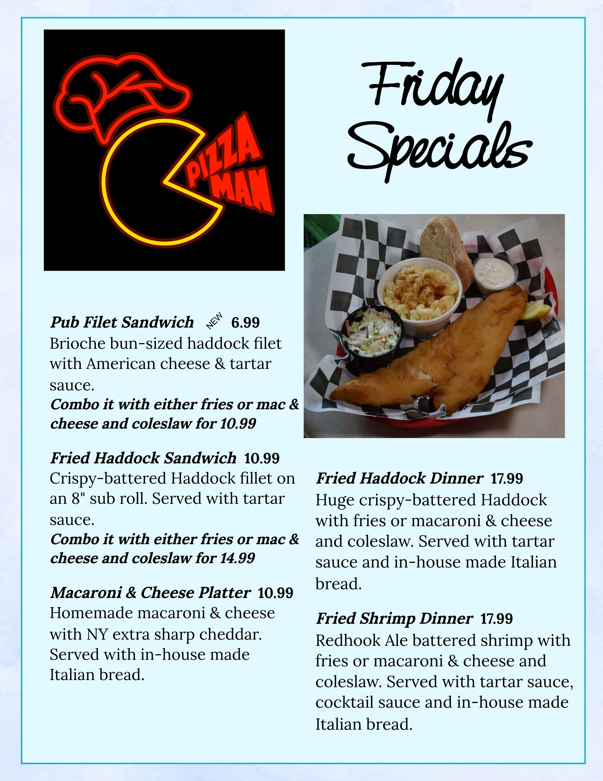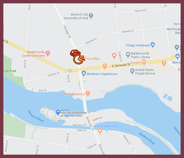 Pizza Man was established over 42 years ago in June of 1983 in Baldwinsville, NY. Since the beginning, we have been a true family business dedicated to serving a high-quality product. We use fresh ingredients and make our dough and sauce on premise daily. Our pizza and wings have won numerous awards at the annual Taste of Baldwinsville competition. In December of 2007, we expanded and opened a pub offering an expanded menu and seating for 60 people. The focal point of our Pub is a beautiful old-style mahogany bar which features 17 draught and over 30 bottled beers. The pub showcases some of the best live musical talent in Central New York most Saturday nights.